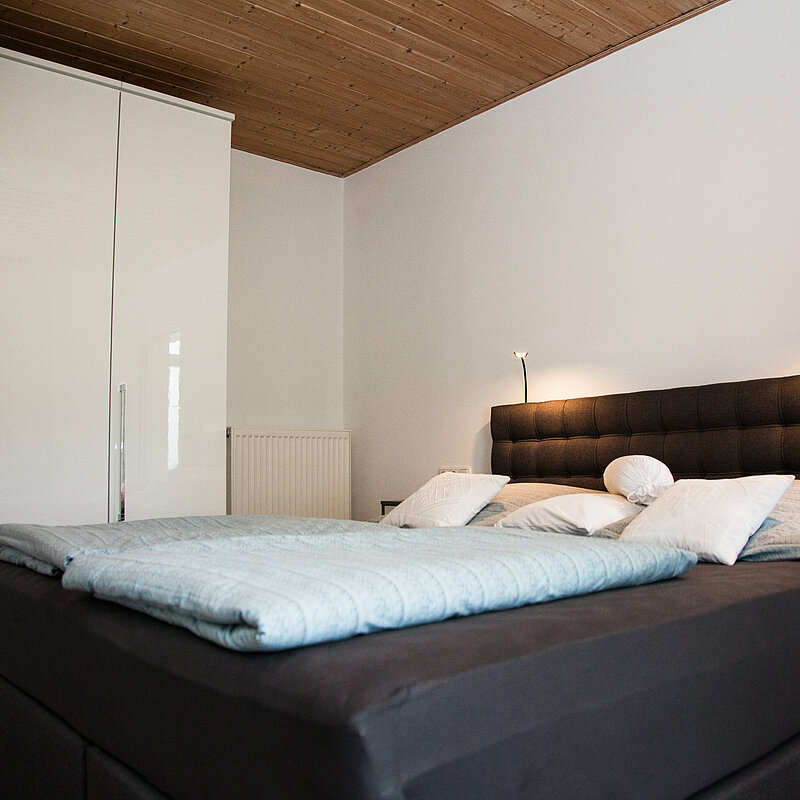 Modern gestaltetes, neu renoviertes Schlafzimmer mit einem großen, bequemen Boxspring-Doppelbett und geräumigem Kleiderschrank.