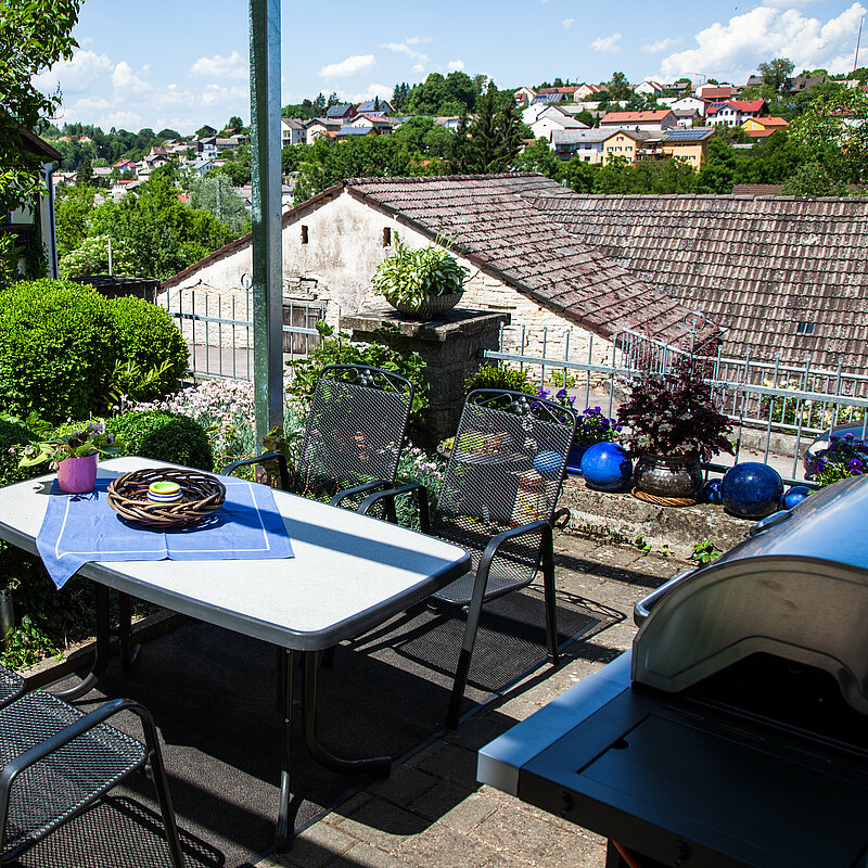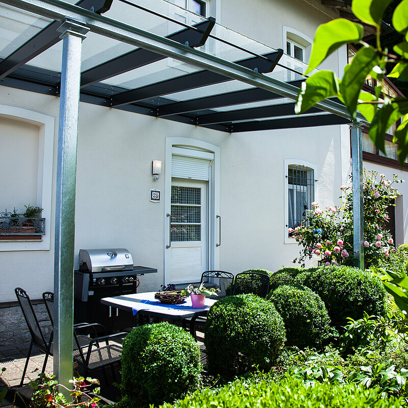 Überdachter Gartenplatz mit Tisch und Stühlen, Grill und einer Sonnenliege. Hier befindet sich auch der Eingang zur Ferienwohnung.